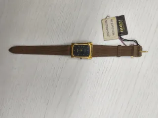 Elegante orologio da polso con un design moderno. - Cassa rettangolare con dettagli dorati. - Cinturino in gomma - Quadrante blu con indici e lancette dorate.
