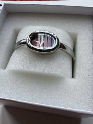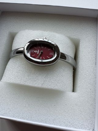 Elegante orologio da polso con cassa ovale e cinturino rigido. - Quadrante color bordeaux. - Dettagli in argento lucido. - Design raffinato.