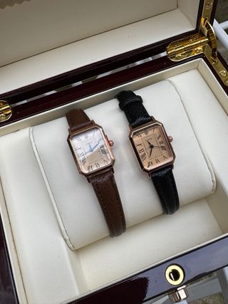 Elegante conjunto de dos relojes de diseño rectangular clásico، inspirado en el estilo vintage y refinado. Sus esferas con números romanos y correas en tonos marrón y negro aportan distinción y personalidad. Perfectos para el uso diario o para ocasiones especiales، combinan fácilmente con looks formales y casuales. Una opción ideal como regalo elegante o para quienes valoran el buen gusto y los detalles.