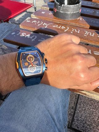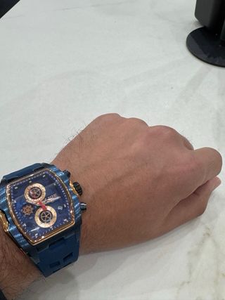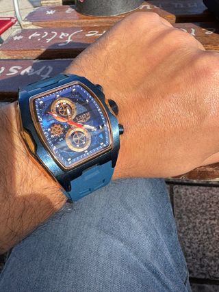 Reloj deportivo de hombre con un diseño moderno y muy original. Caja rectangular robusta con detalles metálicos y esferas decorativas tipo skeleton que le dan un toque único. Correa de silicona azul, cómoda y perfecta para el uso diario. Funciona sin problema y luce espectacular en la muñeca gracias a su estilo llamativo. Estado impecable, sin signos de desgaste. Ideal para quienes buscan un reloj diferente y con personalidad. Entrega en mano o envío disponible