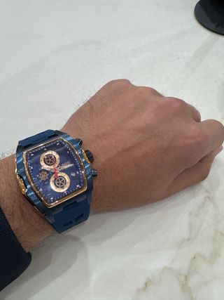 Reloj deportivo con diseño llamativo y moderno, caja de forma cuadrada con detalles elegantes en color azul y dorado. Esfera trabajada con estilo cronógrafo decorativo que le da un aspecto sofisticado y masculino. Movimiento Quartz, lectura clara de la hora y calendario integrado. Correa de silicona azul, cómoda y resistente, ideal para uso diario, salidas y ocasiones informales. Funciona perfectamente y se encuentra en muy buen estado. Una excelente opción para quien busca un reloj diferente, con carácter y presencia, también ideal como regalo