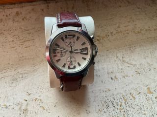 Elegante orologio da polso da uomo con cinturino in pelle marrone e cassa in argento. Buone condizioni, solo qualche segno di usura sul cinturino Pila sostituita - Quadrante bianco con dettagli argento. - Funzione cronografo. - Datario. - Cinturino in pelle marrone con cuciture a vista.