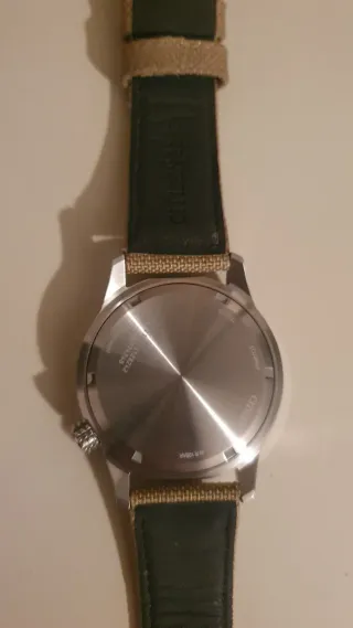 Orologio da polso Citizen Eco-Drive da uomo. La cassa è in acciaio inossidabile e il cinturino è in tessuto color sabbia. - Quadrante nero. - Movimento Eco-Drive. - Ghiera con indicazioni cardinali , scatola, e istruzioni.