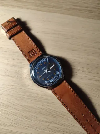Orologio da polso vintage con cinturino in pelle marrone, simile a poljot vostok boctok paketa slava seiko citizen orient, da collezione - con cinturino originale -Quadrante blu. - Scritta CCCP sul cinturino.