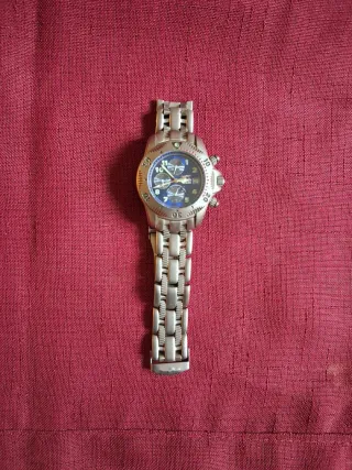 Bellissimo orologio da polso FILA vintage, in metallo color argento e quadrante bianco. - Cronografo con funzioni aggiuntive . - Cassa in acciaio inossidabile. - Bracciale in metallo.Orologio in buone condizioni, bracciale con evidenti segni di usura.
