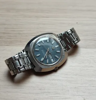 Orologio da polso vintage Avia Automatic. - dimensioni 35 mm esclusa corona - Quadrante blu. - Indici e lancette colorate. - Datario. - Cinturino in metallo argentato.