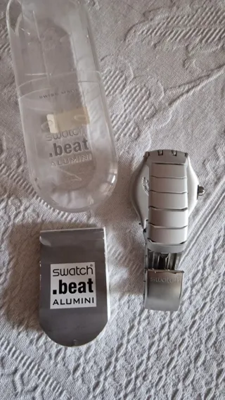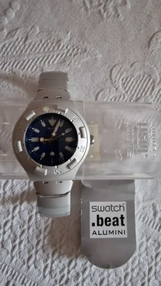 Orologio Swatch Beat Allumini con cassa e cinturino in argento e quadrante blu. - Design moderno e sportivo. - Lunetta girevole con numeri. - Indici luminosi per una facile lettura al buio.