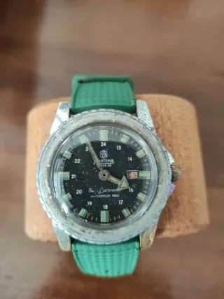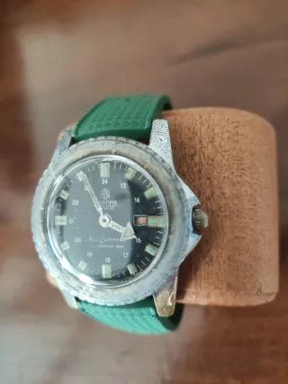 Orologio subacqueo Mortima con movimento manuale. - Modello Superdatamatic. - Quadrante nero. - Cinturino verde.