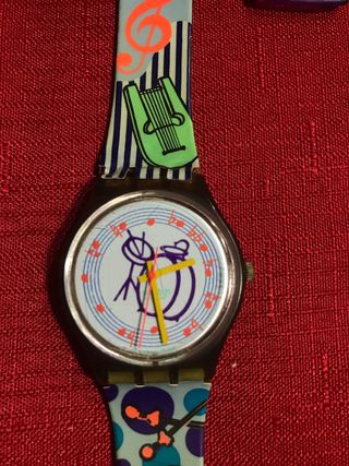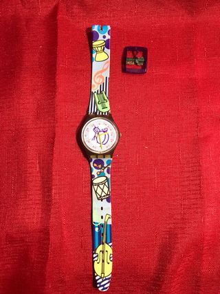 Orologio da polso Swatch Tuba AG del 1991. Il cinturino presenta un design a tema musicale con note, un violino e righe. Cinturino fortemente usurato da sostituire Il meccanismo dell’orologio è perfettamente funzionante Batteria sostituita di recente - Quadrante con note musicali e disegni. - Cinturino colorato con motivi musicali Condizioni come da foto