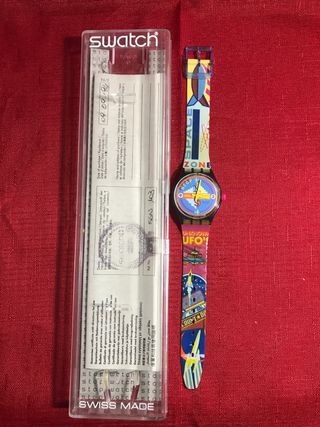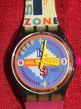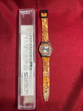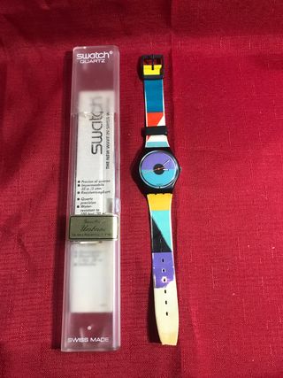 Orologio da polso Swatch modello Esperydes SSN103. Il quadrante presenta un design vivace e colorato. - Cinturino in gomma. Il cinturino ha un piccolo taglietto vicino alla fibbia, come evidenzio nella foto - Chiusura a fibbia. - Anno di produzione 1993. Movimento: quarzo Risistenza all'acqua: 3 bar. Funzioni: Chronograph, Fermare orologio Larghezza del caso: 34,00 mm Altezza del caso: 39,00 mm Spessore del caso: 9,00 mm Riferimento: SSN103.