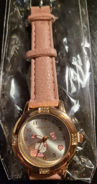 Orologio da polso con cinturino in ecopelle rosa e cassa color oro. - Quadrante con dettagli a tema Hello Kitty. - Decorazioni con strass sulla cassa.
