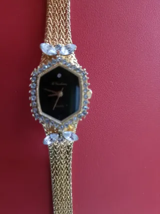 Elegante orologio da donna con un design raffinato. - Cassa esagonale impreziosita da cristalli. - Cinturino in maglia metallica dorata. - Quadrante nero con indici a bastone. Bisogna sostituire la pila