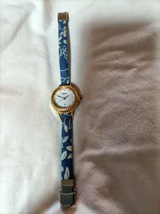 Elegante orologio da polso con cinturino in tessuto. - Cinturino con fantasia floreale blu e foglie bianche. - Cassa dorata. - Quadrante bianco con indici e lancette dorate.