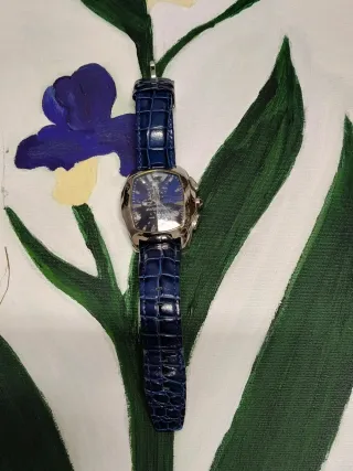 Orologio da polso da uomo, analogico con movimento al quarzo. Il vetro è dicroico di colore blu e giallo, il cinturino è di gomma nera. Mai usato, ancora nella scatola. Misure: cassa 4,5cm; cinturino 26,5cm. Attenzione: non è un cronografo, i quadranti più piccoli sono solo decorativi.