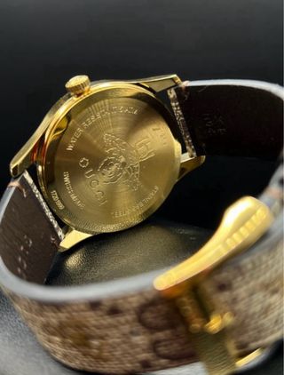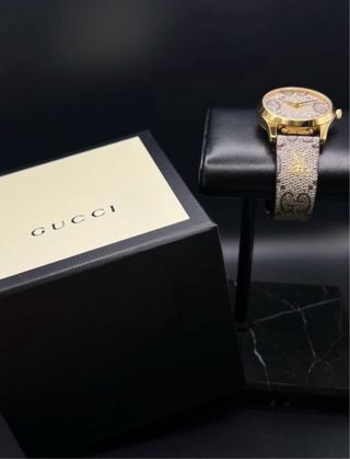 Vendo Gucci G-Timeless originale, ref. YA1264068, unisex, periodo 2020+. Orologio elegante e moderno con cassa in acciaio inox PVD oro, quadrante GG Supreme iconico e cinturino in pelle con chiusura deployant. Movimento al quarzo, preciso e affidabile. Vetro zaffiro antigraffio, impermeabile 50 m. Diametro 38 mm. Condizioni molto buone, con minimi segni di usura. Perfettamente funzionante, scatola originale inclusa (no documenti). Consegna a mano o spedizione assicurata. Prezzo leggermente trattabile.