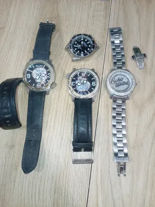 Lotto composto da diversi orologi da sistemare. I due uguali hanno da cambiare la batteria e il bracciale e da far sistemare alcuni brillanti all'interno della cassa. Quello color acciaio ha da fare rimettere il perno che tiene ferma la chiusura, quello dietro è automatico e manca il bracciale NON SI ACCETTANO RESI IN QUANTO LA MERCE È NELLE CONDIZIONI VISIBILI E DESCRITTE