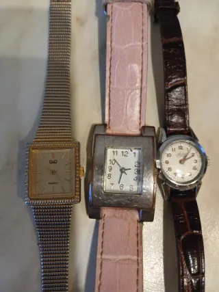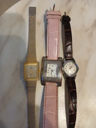 Tre orologi da polso da donna, risalenti agli anni '70, necessitano di revisione. - Orologio con cinturino in maglia metallica dorata.quarzo Q&Q made in Japan - Orologio con cassa quadrata e cinturino rosa.quarzo componenti svizzero - Orologio con cassa rotonda e cinturino marrone.Automatico svizzero