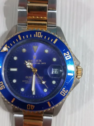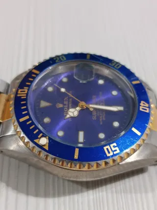Quadrante: Blu con indici geometrici luminescenti e finestra della data a ore 3 (dotata di lente dente d'ingrandimento). Cassa: Dimensioni generose (circa 44mm inclusa corona, come da foto con calibro), ideale per chi ama un orologio di presenza al polso. Cinturino: Modello Oyster bicolore con chiusura di sicurezza e logo. Condizioni: L'orologio è perfettamente funzionante. Esteticamente presenta i normali segni del tempo e dell'usura, con alcune zone dove la placcatura dorata è leggermente sbiadita (visibile soprattutto sulla corona e nella parte interna del cinturino), che conferiscono all'oggetto un carattere "vissuto" e vintage.