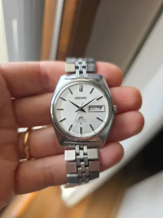 Orologio Seiko Lord Matic ref. 5606-7000. Completamente originale, con il suo vetro ed il suo bracciale di fabbrica. Funziona tutto compreso lo scatto rapido del datario (elemento da verificare sempre su questa referenza). Cassa in stile grammar of design che contraddistingue gli orologi Seiko degli anni 70, mai lucidata quindi conserva perfettamente tutte le sue forme spigolose. Oggetto da collezione! Nel mio profilo altri orologi Seiko vintage.