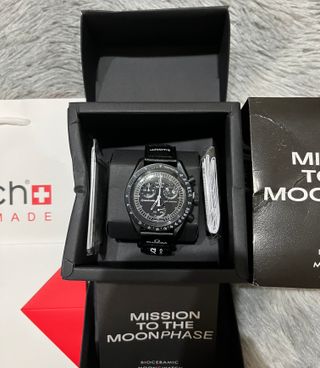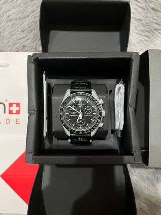 Orologio Omega x Swatch, modello Mission to the Moonphase. - Cassa e cinturino neri. - Dettagli in argento sul quadrante.