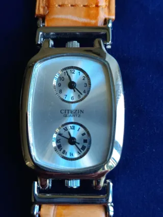 Orologio marca CITEZIN 📌(NON è Citizen, ma CITEZIN come riportato chiaramente sul quadrante e visibile in foto). Si tratta di un marchio differente da Citizen. Modello quarzo con doppio quadrante (dual time) e doppia corona: • doppio orario indipendente • due movimenti al quarzo • batterie nuove appena sostituite • perfettamente funzionante • cassa color acciaio Cinturino in vera pelle colore marrone/arancio (aftermarket, non originale). Le foto fanno parte integrante della descrizione. Vendita tra privati, oggetto descritto in modo chiaro. Vendo visto e piaciuto.