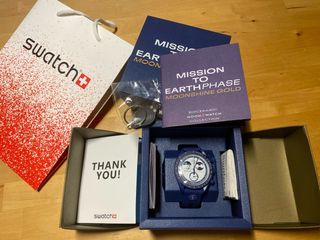Orologio Swatch Mission to Earth Moonshine Gold della collezione Bioceramic Moonswatch. - Cassa in bioceramica blu. - Quadrante bianco con dettagli dorati. - Cinturino in velcro blu. - Orologio nuovo completo di tutto, con ancora la pellicola originale nel vetrino