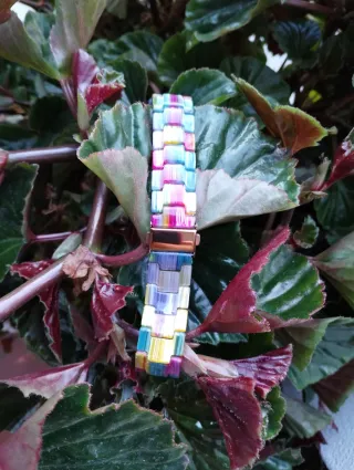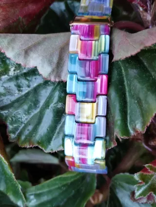 Cinturino per orologi alto 22 mm. Resina perlata multicolore. Usato 3 giorni. Perfettamente funzionante, regolabile e fornito con attrezzatura per installarlo ed istruzioni.