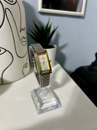 Elegante orologio da polso da donna con cassa e bracciale in finitura oro. - Movimento al quarzo. - Quadrante con indici applicati. - Bracciale in maglia. - Chiusura deployante. Citizen quartz da donna. Dorato, con cinturino abbinato. Vetro a prisma con bellissimo effetti alla luce. Manca indice h 1/4/6 Cassa da 33 Perfettamente funzionante