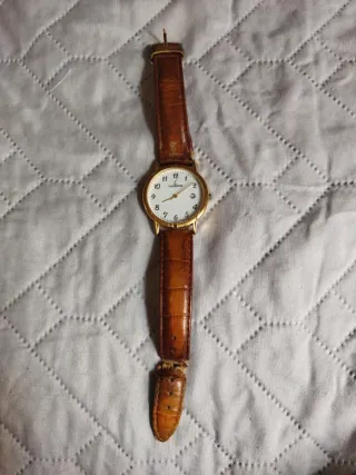 Elegante orologio da polso con cinturino in pelle. - Cassa color oro. - Cinturino in pelle marrone con finitura effetto coccodrillo. - Quadrante bianco con indici e datario. Da cambiare batteria e conturino