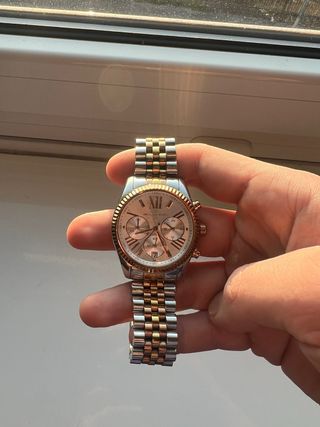 Splendido cronografo Michael Kors originale (mod. MK8344), elegante design bicolore argento/oro rosa con bracciale stile Jubilee. Un classico intramontabile, perfetto per ogni occasione. • Quadrante: Champagne con numeri romani e datario a ore 6. • Stato: Ottime condizioni estetiche, lievi segni di usura come da foto. • Nota: La batteria è da sostituire (operazione semplice ed economica). Prezzo competitivo per rapido realizzo. Disponibile per spedizione. Contattatemi per info!