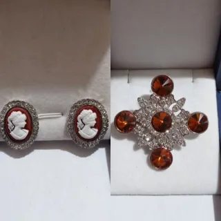 Elegante parure in stile retrò, composta da orecchini a clip con cammeo e una spilla coordinata. - Orecchini con cammeo su fondo marrone e bordo tempestato di strass. - Spilla a forma di croce con pietre color ambra e dettagli in strass. In confezione regalo 🎁