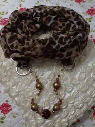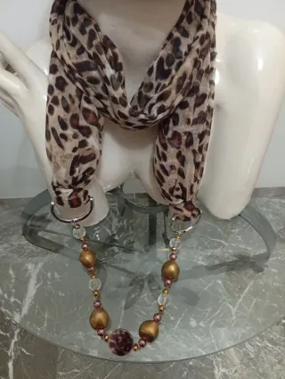 Elegante pashmina con dettagli gioiello, realizzata a mano. Un pezzo unico che aggiunge un tocco di classe. - Design con stampa animalier. - Inserti metallici e perline decorative. - Anelli in metallo per un look moderno.