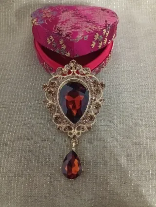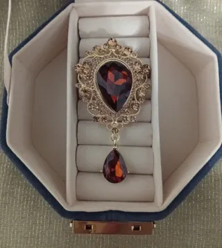 Spilla di moda con un design che evoca lo stile retrò. - Dettagli in oro. - Pietra centrale di colore marrone intenso. - Pendente a goccia. - Cornice decorata con piccole pietre. - Chiusura a spilla sul retro. In confezione regalo
