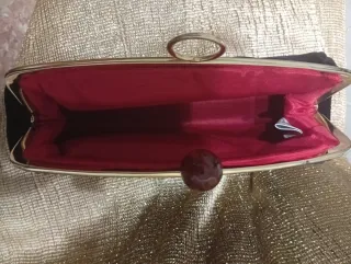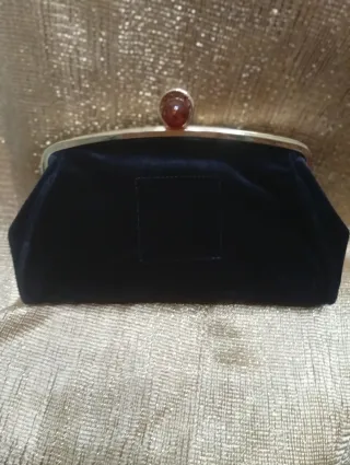 Elegante pochette vintage in velluto nero, con chiusura dorata e un dettaglio sferico color ambra. - Materiale: velluto - Colore: nero - Dettagli: chiusura dorata, perla color ambra H 18 cm L 28 cm