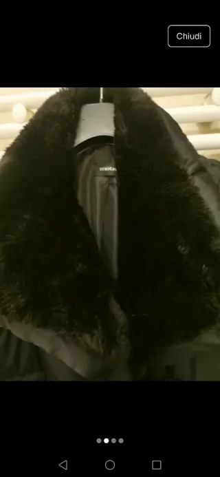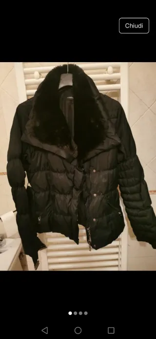 Elegante piumino nero con dettagli in pelliccia sintetica. - Collo ampio e morbido. - Chiusura frontale con zip e bottoni. - Cintura in vita per un fit personalizzato. - Tasche laterali con zip.