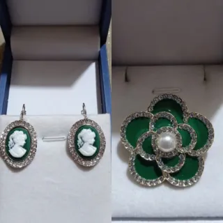 Elegante parure composta da orecchini con cammeo e spilla fiore - Orecchini a foro con cammeo e dettagli luminosi. - Spilla a forma di fiore con perla centrale e cristalli. In confezione regalo🎁