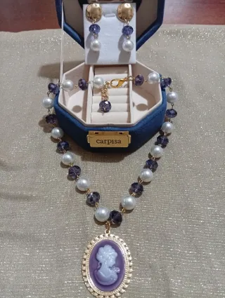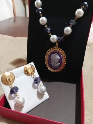 Elegante parure di gioielli composta da collana girocollo con lunghezza regolabile e orecchini, realizzata con lavorazione rosario perle e cristalli sfaccettati. - Collana con pendente cammeo ovale e perle. - Orecchini pendenti con perle e cristalli. - Dettagli in metallo color oro e cristalli viola. In confezione regalo.SCONTO 50%