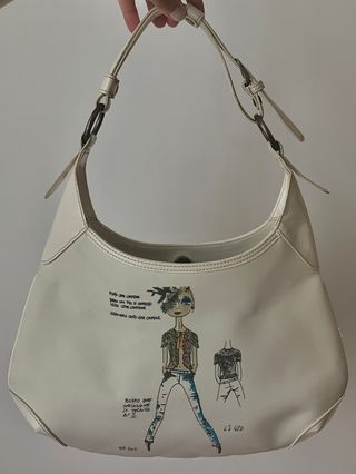 Borsa Moschino Jeans Vintage, rarissima e da collezione. Modello early 2000s, quasi introvabile in questa forma e nel raro colore bianco panna. In nylon con dettagli in PVC, presenta una grafica iconica con vere annotazioni tecniche da bozzetto Moschino (“Filato come campione”, “Bordo con filo di contrasto”, “Gros grain lavato”). Hobo bag piccola/media, usata pochissimo e in condizioni eccellenti. Perfetta per collezionisti e amanti del vintage Moschino.