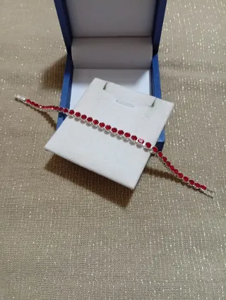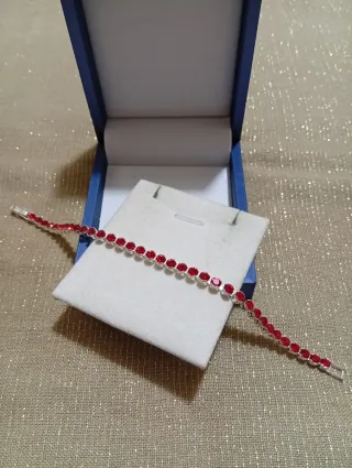 Elegante bracciale tennis con pietre rosse, completo di confezione regalo. - Design classico e luminoso. - Chiusura sicura. - Ideale come regalo. - Lunghezza 18cm-