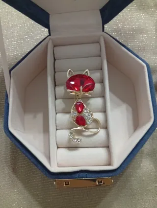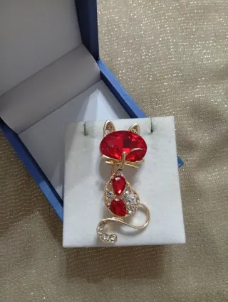 Bellissima spilla stile retrò a forma di gatto, perfetta come idea regalo. - Design elegante con pietre rosse e bianche. - Finitura color oro. - Presentata in una confezione regalo