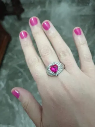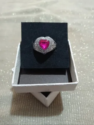 Elegante anello a forma di cuore con un design che ricorda lo stile retrò. Viene presentato in una confezione regalo, rendendolo un'ottima opzione per un dono. - Pietra centrale a forma di cuore. - Dettagli scintillanti attorno alla pietra principale. - Montatura in metallo color argento.