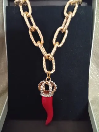 Elegante collana girocollo con ciondolo a forma di corno portafortuna di buon auspicio per il nuovo anno.Lunghezza regolabile. - Catena a maglie larghe. - Ciondolo con corno rosso. - Corona tempestata di strass.SCONTO 50%