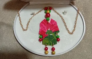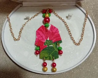 Collana fatta a mano con un ciondolo a forma di kimono realizzato in tessuto vintage alta moda.Un pezzo unico e originale. - Ciondolo a forma di kimono. - Realizzato in tessuto con fantasia floreale. - Decorata con perline rosse e verdi. - Catena color oro- Tessuto vintage alta moda in puro cotone a motivi orientali- - Collana lunga regolabile- Retro kimono glitterato a tinta unita- In confezione regalo- SCONTO 50%