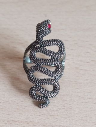 Anello a forma di serpente con dettagli finemente lavorati. La testa del serpente è impreziosita da due piccole pietre rossa. In vendita anello a forma di serpente con pietre rosse negli occhi, in buono stato, come da foto. Presente alcuni segni di ossidazione nel cerchio dell'anello. - Design a serpente stilizzato. - Dettagli a grana fine su tutta la superficie. - Pietre rosse incastonate sulla testa.
