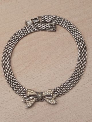 Elegante collana con ciondolo a forma di fiocco, impreziosito da strass luminosi. La catena è realizzata con una maglia a grana di riso. - Ciondolo a forma di fiocco. - Dettagli con strass. - Maglia a grana di riso. Buono stato di conservazione, mancano due pietrine nel nastro, come si può vedere in fotografia.