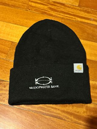 Cappellino invernale Carhartt di colore nero, con logo Bridgewater Bank ricamato sul davanti. - Logo Bridgewater Bank ricamato. - Etichetta Carhartt. - Materiale in maglia.