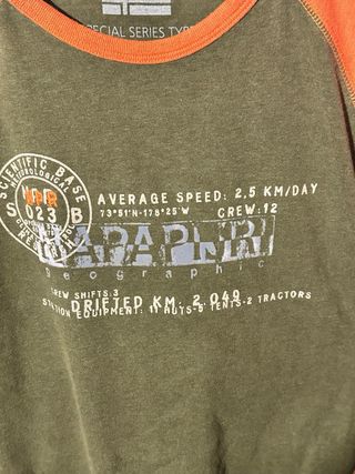 Maglia a maniche lunghe con design a contrasto. - Maniche raglan arancioni. - Corpo della maglia verde. - Stampa grafica sul petto con dettagli a tema Scientific Base e coordinate geografiche.