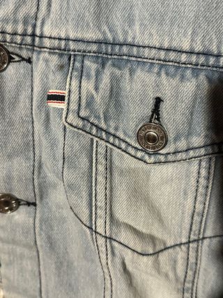 Giacca in denim foderata in sherpa, perfetta per le giornate più fredde. - Collo in sherpa caldo e confortevole. - Chiusura con bottoni. - Tasche sul petto con patta e bottone. Due piccole macchie una davanti e una dietro