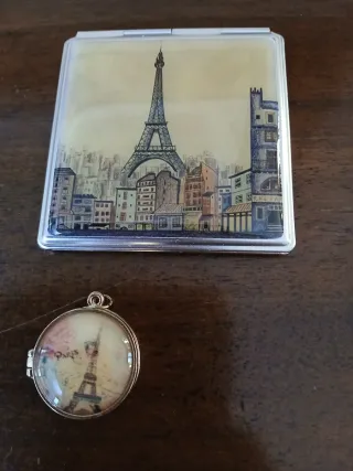 Set composto da uno specchietto e un ciondolo portafoto, entrambi con un'immagine a tema Parigi. - Specchietto con decorazione della Torre Eiffel e skyline parigino. - Ciondolo rotondo con immagine della Torre Eiffel e scritta Paris.