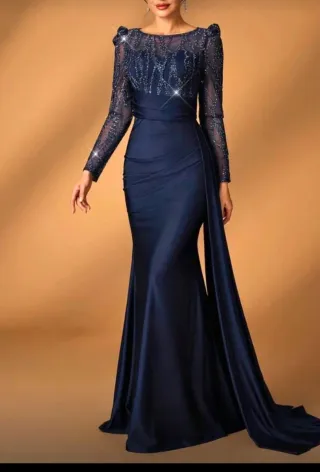 Elegante abito da cerimonia color blu notte, perfetto per occasioni speciali. La taglia è M. - Tessuto con dettagli scintillanti sul corpetto e sulle maniche. - Design con drappeggio sul fianco. - Gonna a sirena con strascico.